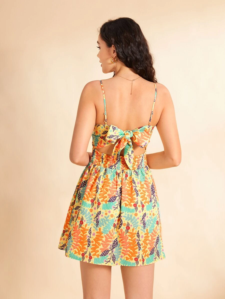 Vestido de tirantes con estampado de planta con fruncido de espalda abierta con cordón