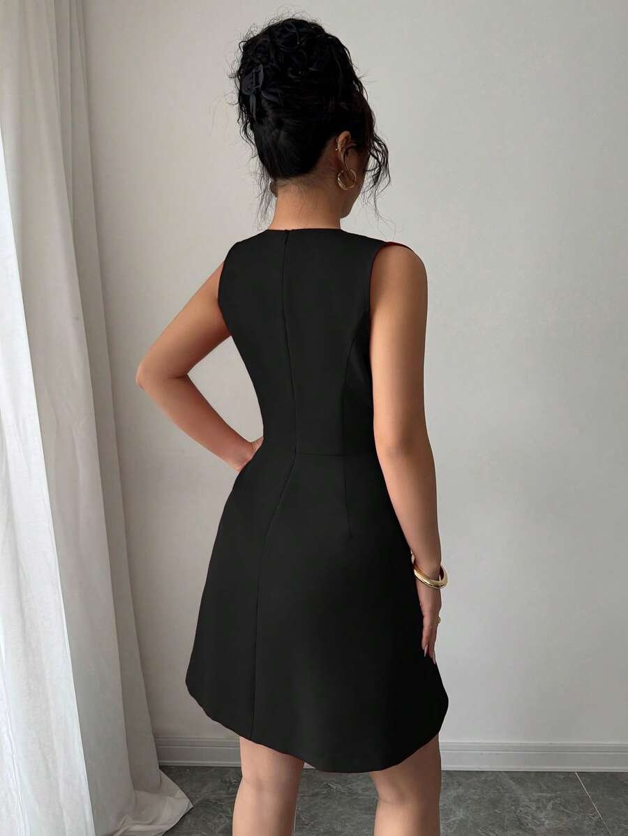 Vestido elegante con cuello en V y pliegues metálicos