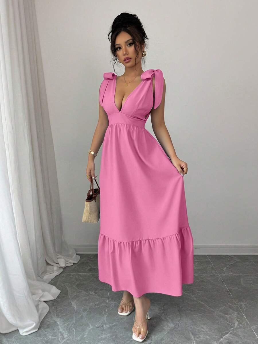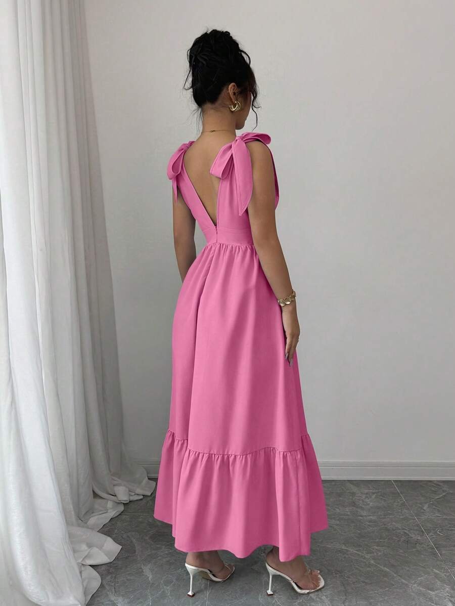Vestido elegante sin mangas con escote en V y cintura anudada con lazo