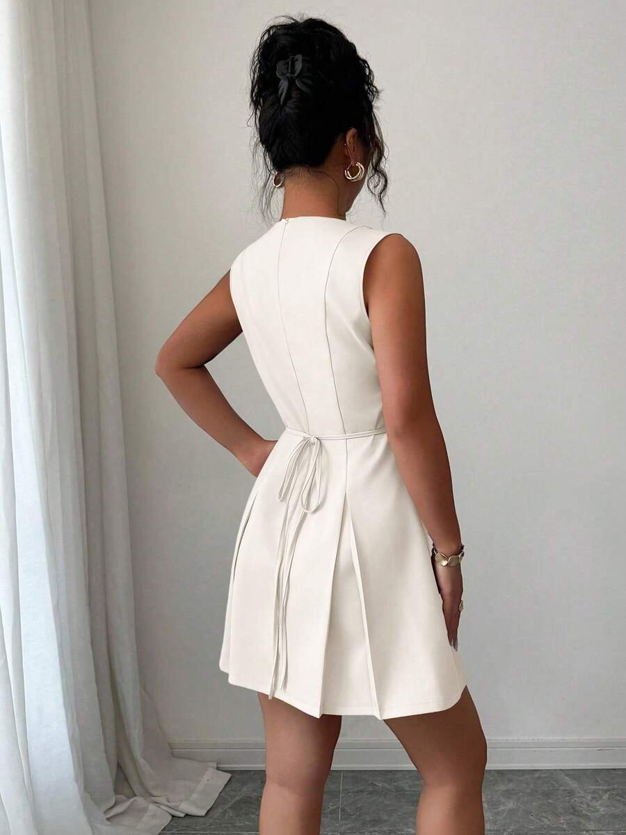 Vestido elegante y vintage francés con lazo en la cintura y botones