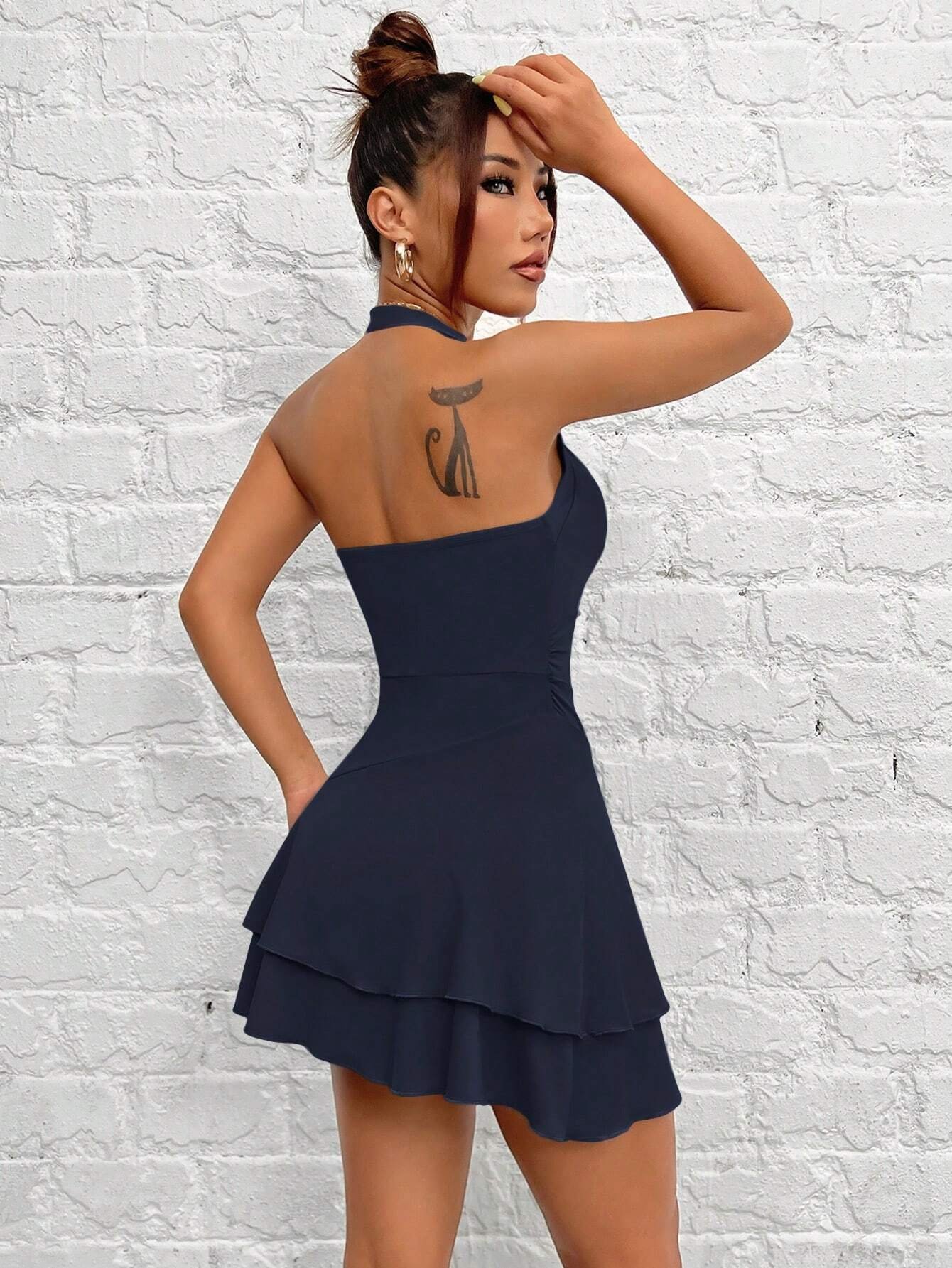 Vestido halter sin espalda con volantes en la cintura de un solo color