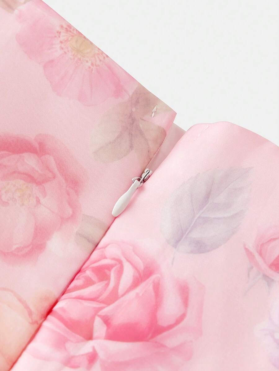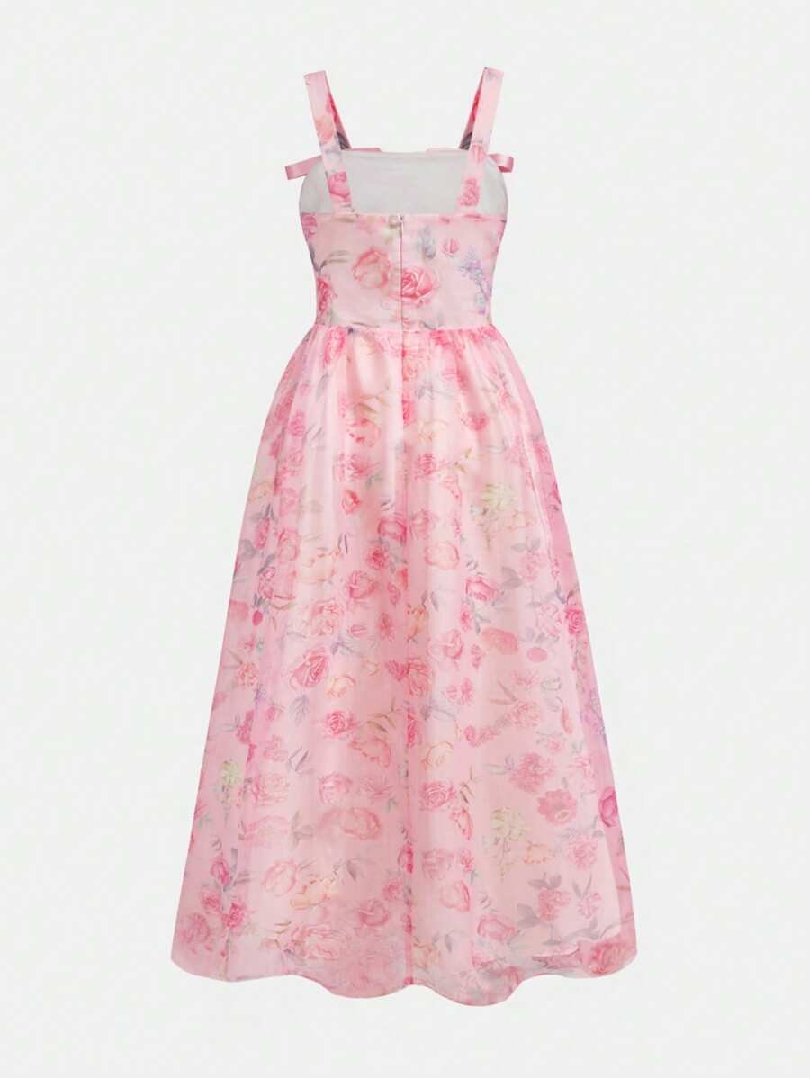 Vestido largo de malla con estampado floral de rosas y recogido en la cintura