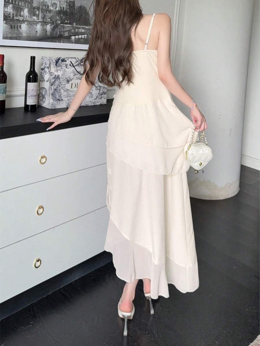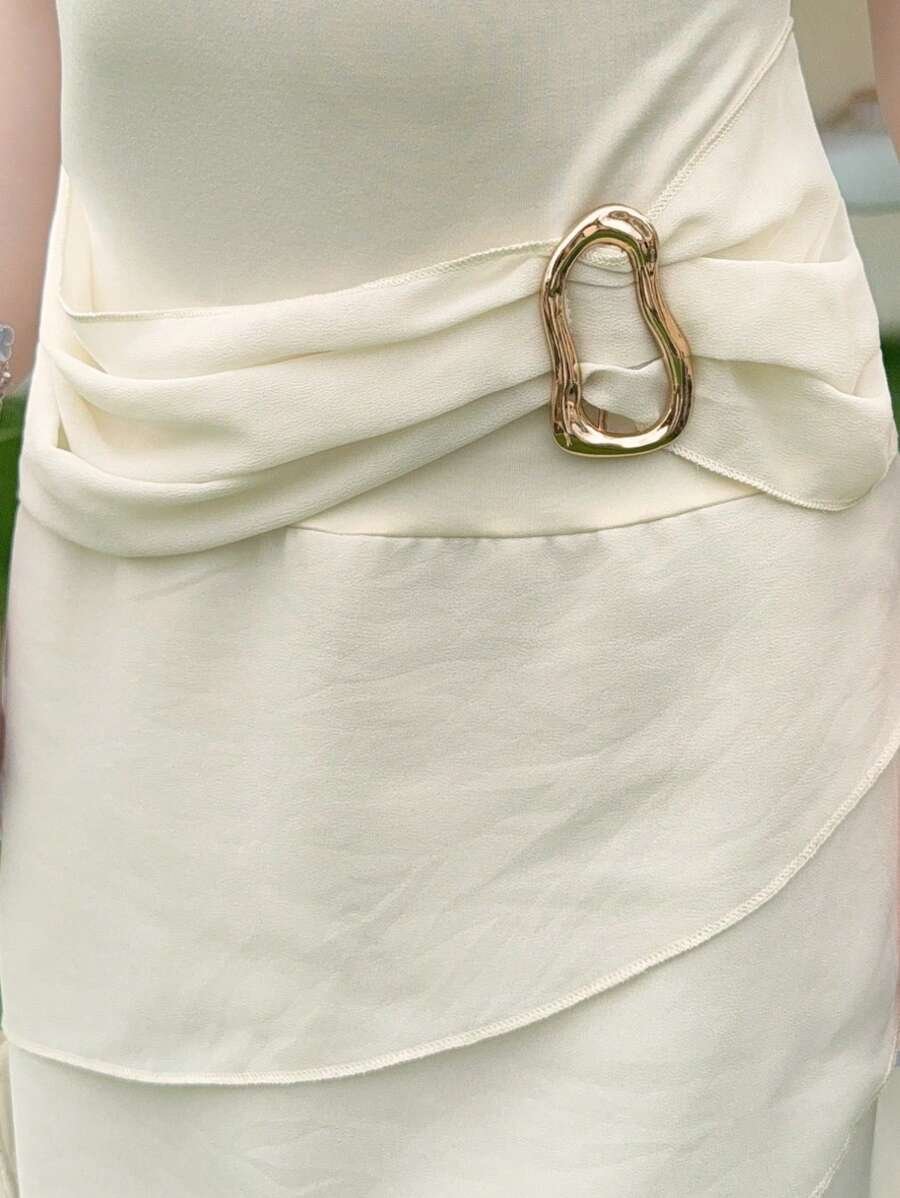 Vestido largo de satén con cuello drapeado y detalle de volantes
