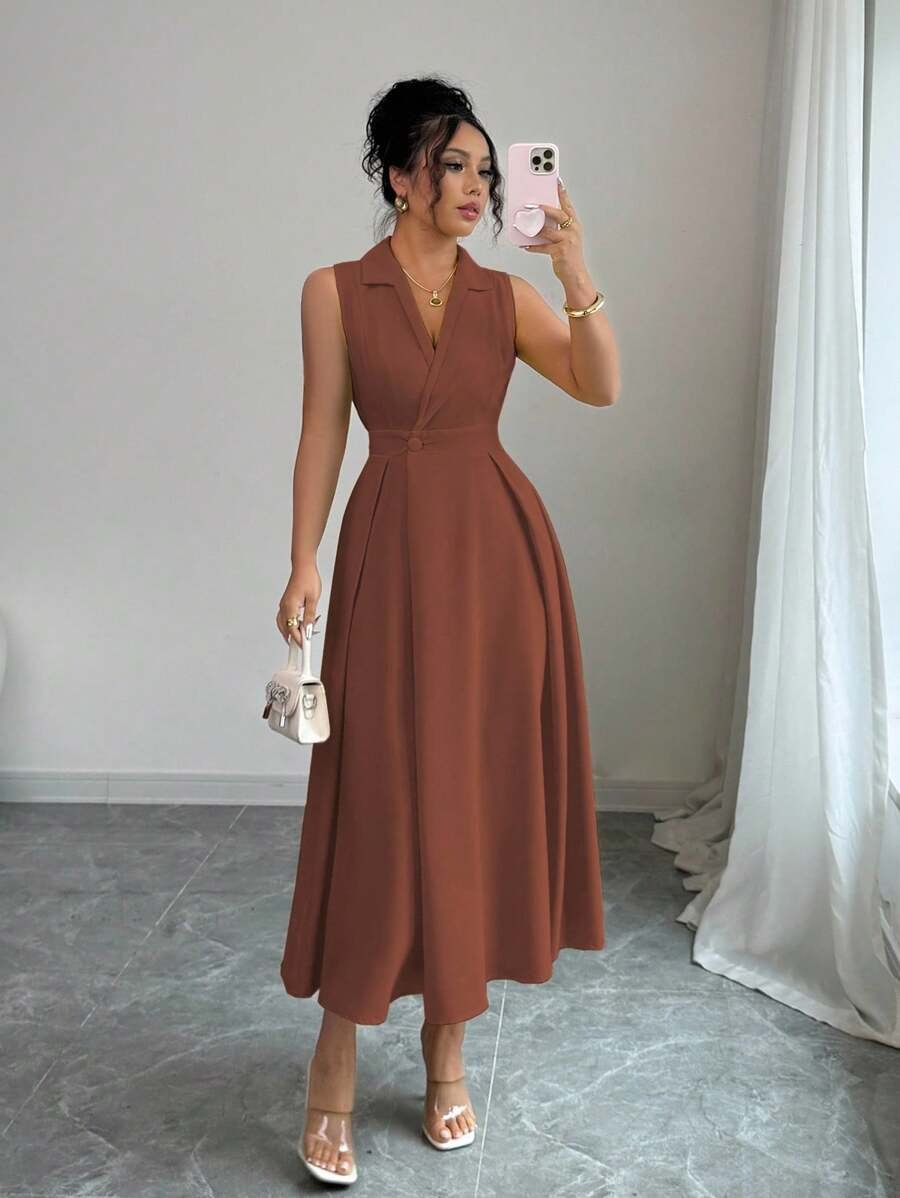 vestido maxi con cuello en V, sin mangas y cintura con lazo