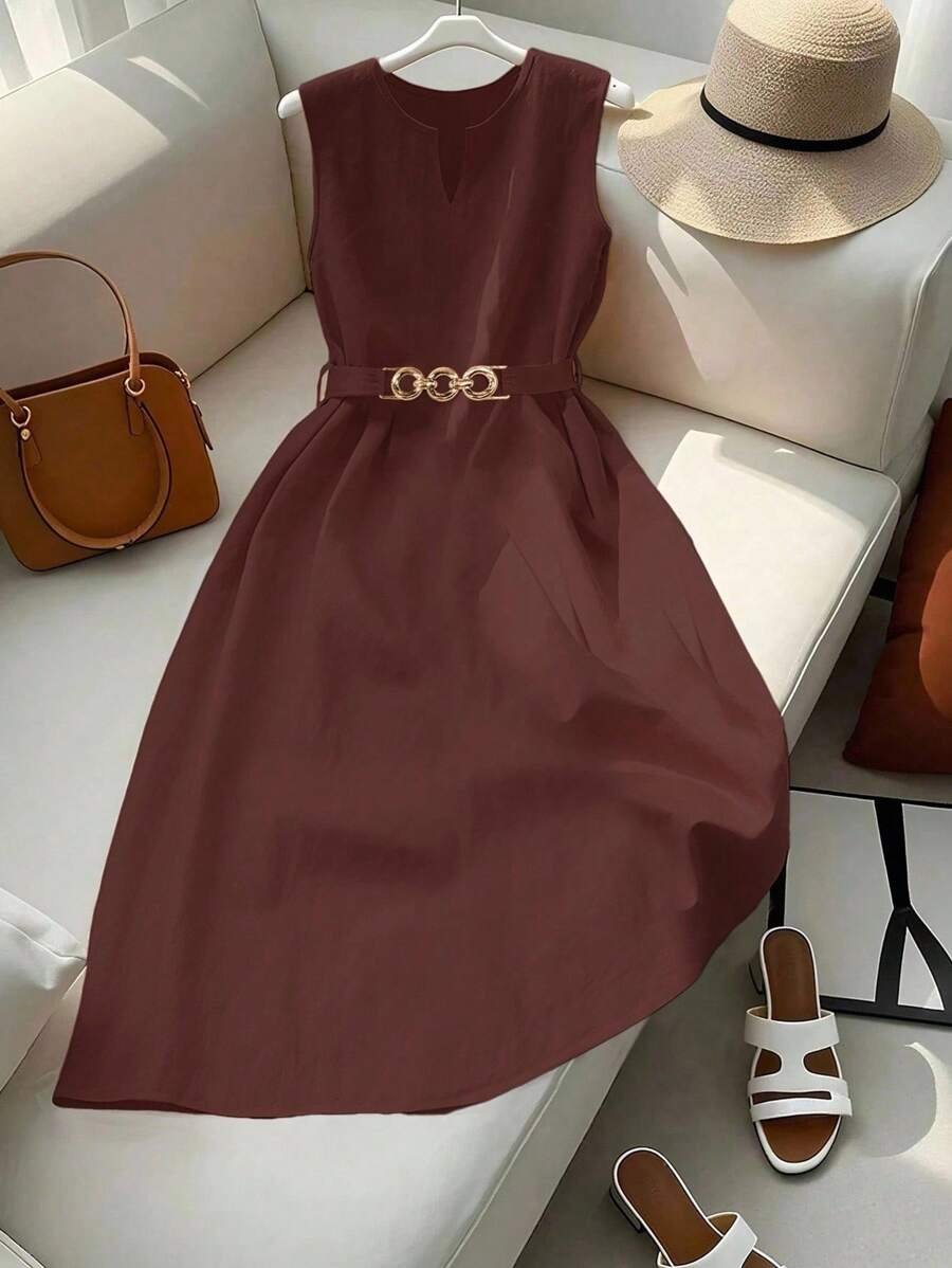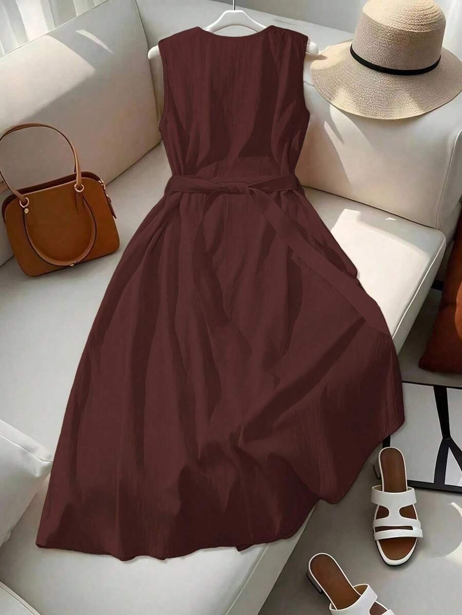 Vestido midi naranja elegante de mujer con escote en V