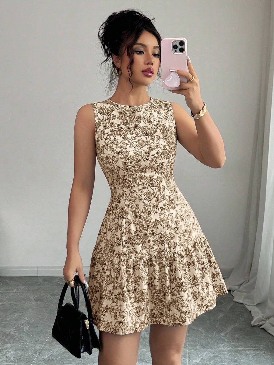 Vestido mini bohemio elegante francés con estampado floral sin mangas y cinturón