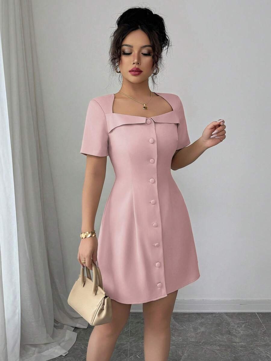 Vestido mini de manga corta con cuello de trapezoide elegante