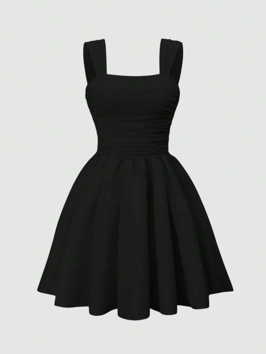 Vestido negro formal elegante y cómodo con volantes y tirantes anchos