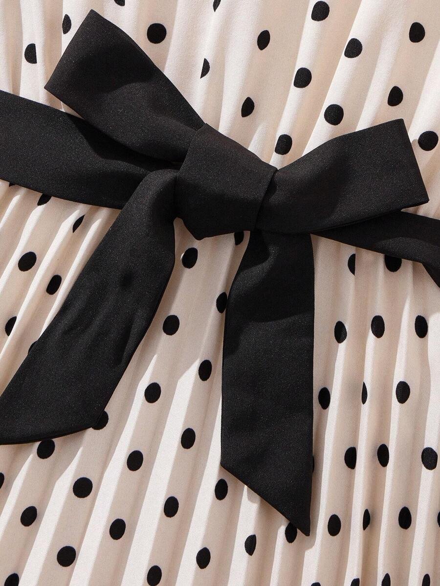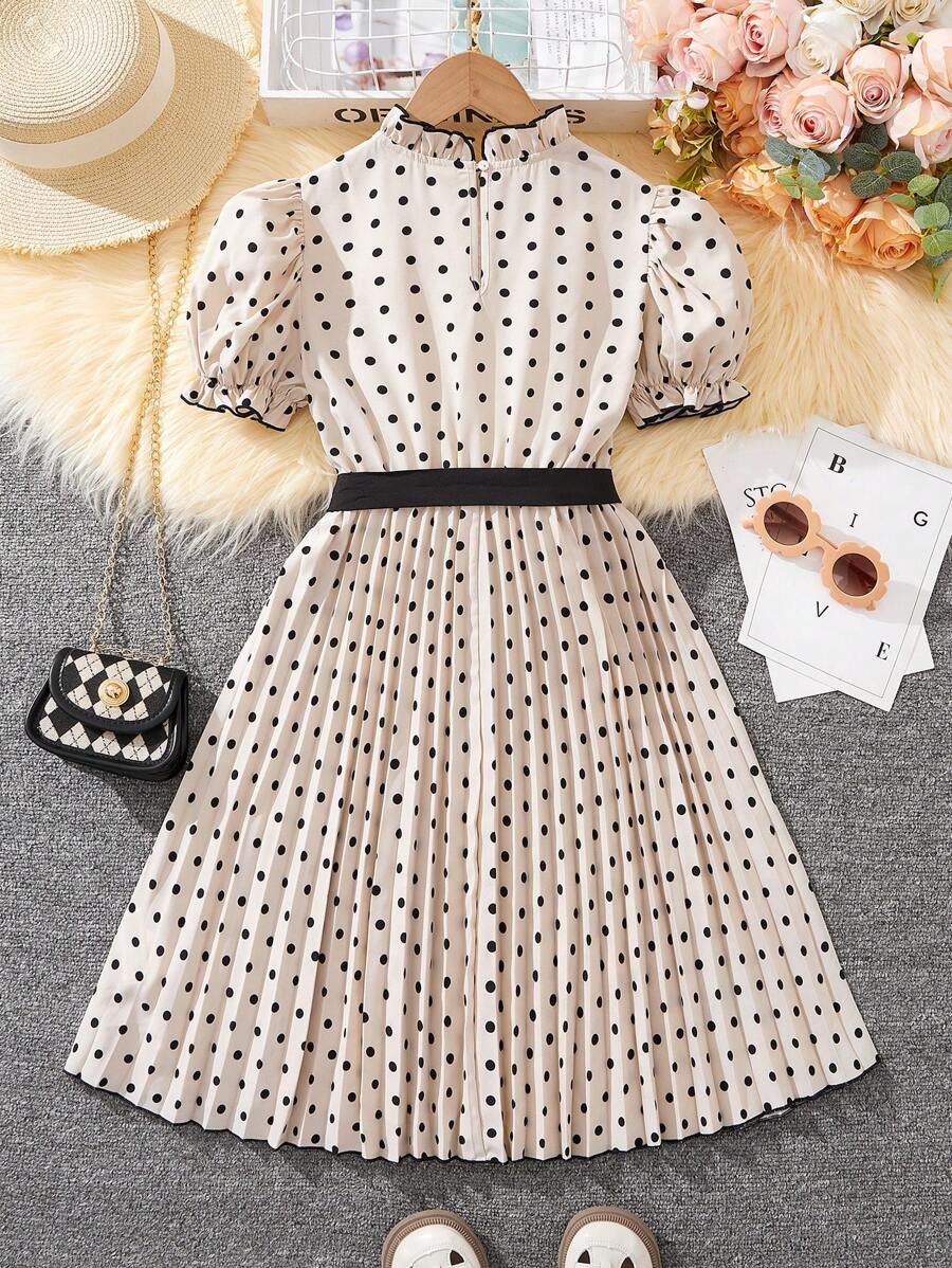 Vestido Plisado De Lunares, Manga Abullonada Y Cinturón Desmontable