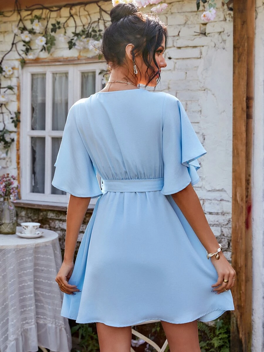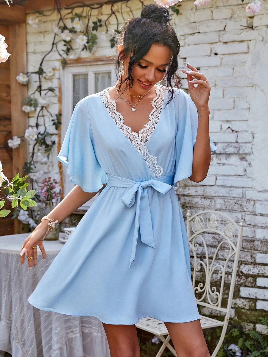 Vestido swing con cinturón de manga con volante con encaje en contraste