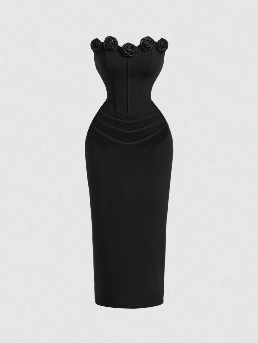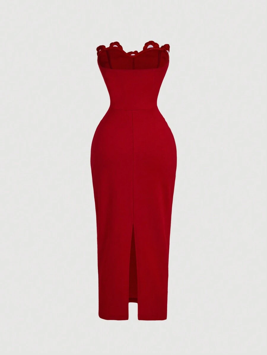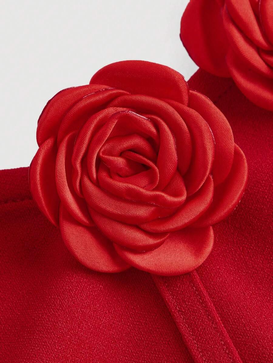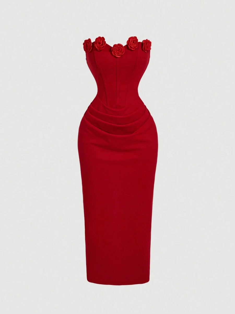 Vestido tubo midi con fruncidos y flores 3D en color rojo